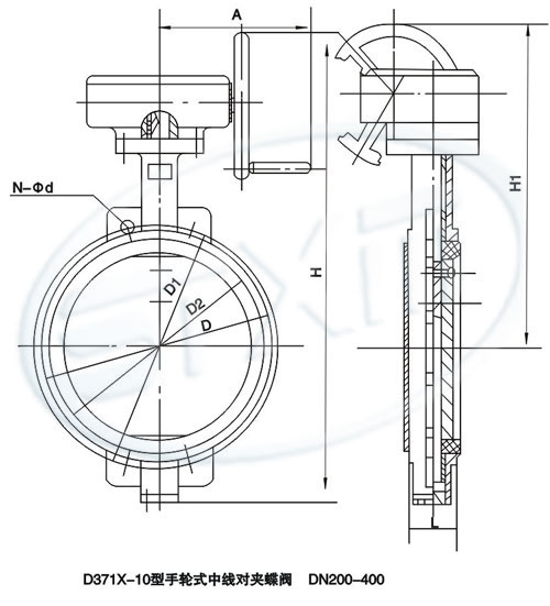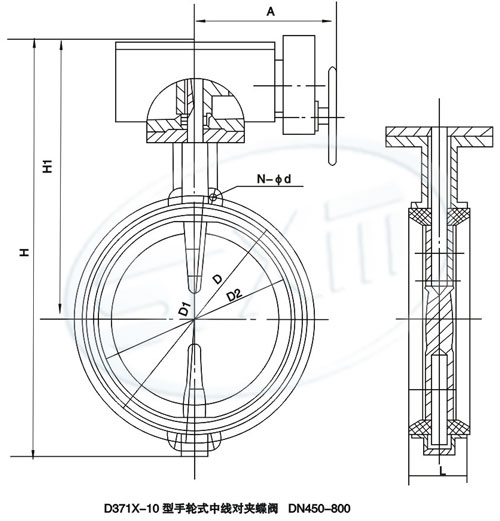 D371X-10型手輪式中線對夾蝶閥用手輪通過蝸輪付驅動蝶板完成啟閉動作。與手柄式中線對夾蝶閥相比是一種較為省力的蝶閥。本閥可任意位置安裝,無方向性。
