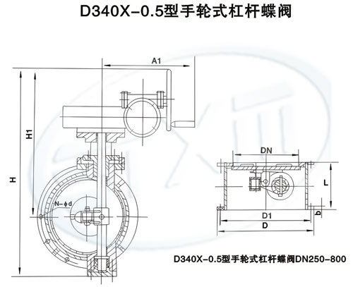 D340X-0.5型手輪式杠桿蝶閥用手輪通過傳動箱驅動蝶板完成啟閉動作。傳動箱上裝有指針可指示蝶板工作位置。本閥用于現場操作的場合。本閥安裝時請注意介質流向應符合閥體上箭頭的指向。
