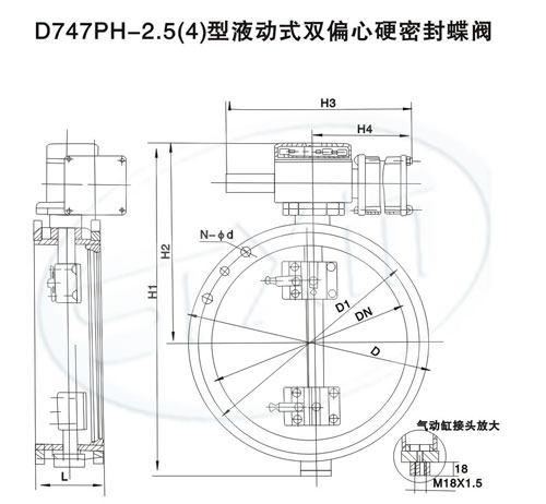 D747PH-2.5(4)型液動雙偏心硬密封蝶閥采用液動裝置驅動蝶板完成啟閉動作。蝶板的啟閉位置可通過傳動箱蓋上的行程開關進行信號顯示。本閥適用于遠距離控制場合。