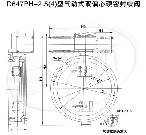 D647PH-2.5(4)型氣動式雙偏心硬密封蝶閥用氣動裝置驅動蝶板完成啟閥動作。本閥蝶板的啟閉位置可通過傳動箱蓋上的行程開關進行信號顯示。本閥適用于遠距離控制的場合。本閥DN500以下為單缸驅動;DN600-DN1200為雙缸驅動。