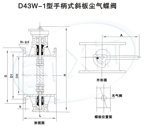D43W-1型手柄式塵氣蝶閥利用手柄轉動蝶板完成啟閉動作。手柄上有7個弧形齒孔,每孔間隔13°,蝶板轉到一定位置用定位螺栓卡入齒孔并旋轉,以固定蝶板的工作位置。本閥安裝于水平管道時請參照圖中所示確定安裝方向,以防止塵灰堆積增加閥門開啟阻力。