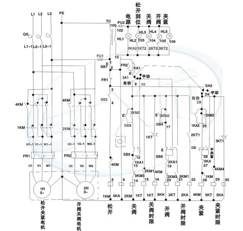 DTK-2型電動推桿控制箱是F9T43-0.5型電動式扇形盲板閥的專用控制箱。它具有手動和自動兩種可能。手動操作通過按鈕SB2、SB5、SB6、SB7分別控制閥體松開、閥板翻轉、閥體夾緊等動作。自動操作時按下按鈕SB2待閥門夾緊部松開到位后再按開、關選擇按鈕SB3或SB4即可完成全部動作。手動和自動的轉換通過轉換開關SA來完成。另有緊急停機按鈕SB1。電源通斷和各步動作到位情況由行程開關和時間繼電器按整定時間控制并由指示燈顯示。操作原件、顯示元件集中在控制箱門板上,電器控制元件安裝在箱內。行程開關XK安裝在閥門上。
