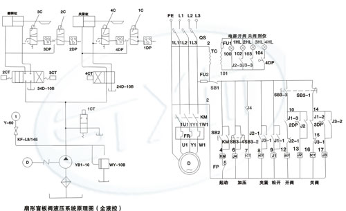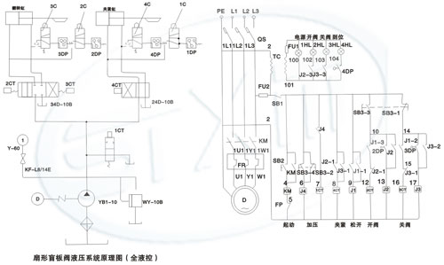 YYZ·D-10型電動液壓站是與液動式扇形盲板閥配套使用的專用液壓站。液壓站的電器控制元件均安裝在液壓站配電箱內。液壓站電源3N-380V,50HZ.控制回路變壓器“BK”供給電壓220V。操作元件集中在液壓站面板上,行程開關1XK、2XK、3XK、4XK分別安裝在盲板閥上。液壓站具有手動、電動兩種功能。手動(手動操作按鈕)主要用于調試。電動(由電器控制自動完成分步動作)功能用于正常使用。本液壓站的工作原理和使用方法詳見說明書。