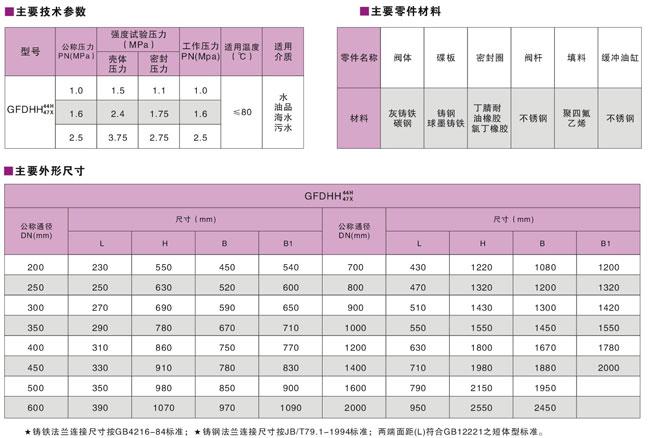 GFDHH 44H/47X 型蝶式緩沖止回閥主要用于工業供排水、污水處理廠的水泵出口處,防止管網中介質逆流,自動消除破壞性水錘,從而保證水泵和管路不受損壞。該閥主要由閥體、閥瓣、緩沖裝置和微量調節閥組成。該產品具有結構新穎、體積小、流體阻力小、運行平穩、密封可靠、耐沖刷、耐磨損、緩沖性能好等特點,是工業用水和城市排污的最佳產品。