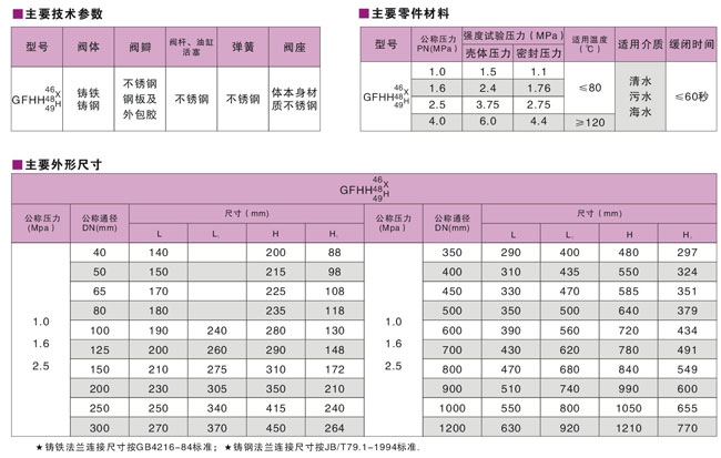 本廠生產的GFHH 46/48/49X/H 消聲緩閉止回閥系列產品可用在清水、污水、海水等介質的排水管道上,既能防止介質的倒流,又能有效的限制破壞性水錘,保證管線的使用安全。它具有結構新穎、體積小、重量輕、流體阻力小、密封可靠、啟閉平穩、耐磨損、使用壽命長,油壓、緩閉不受介質影響,有效好節能效果等特點。